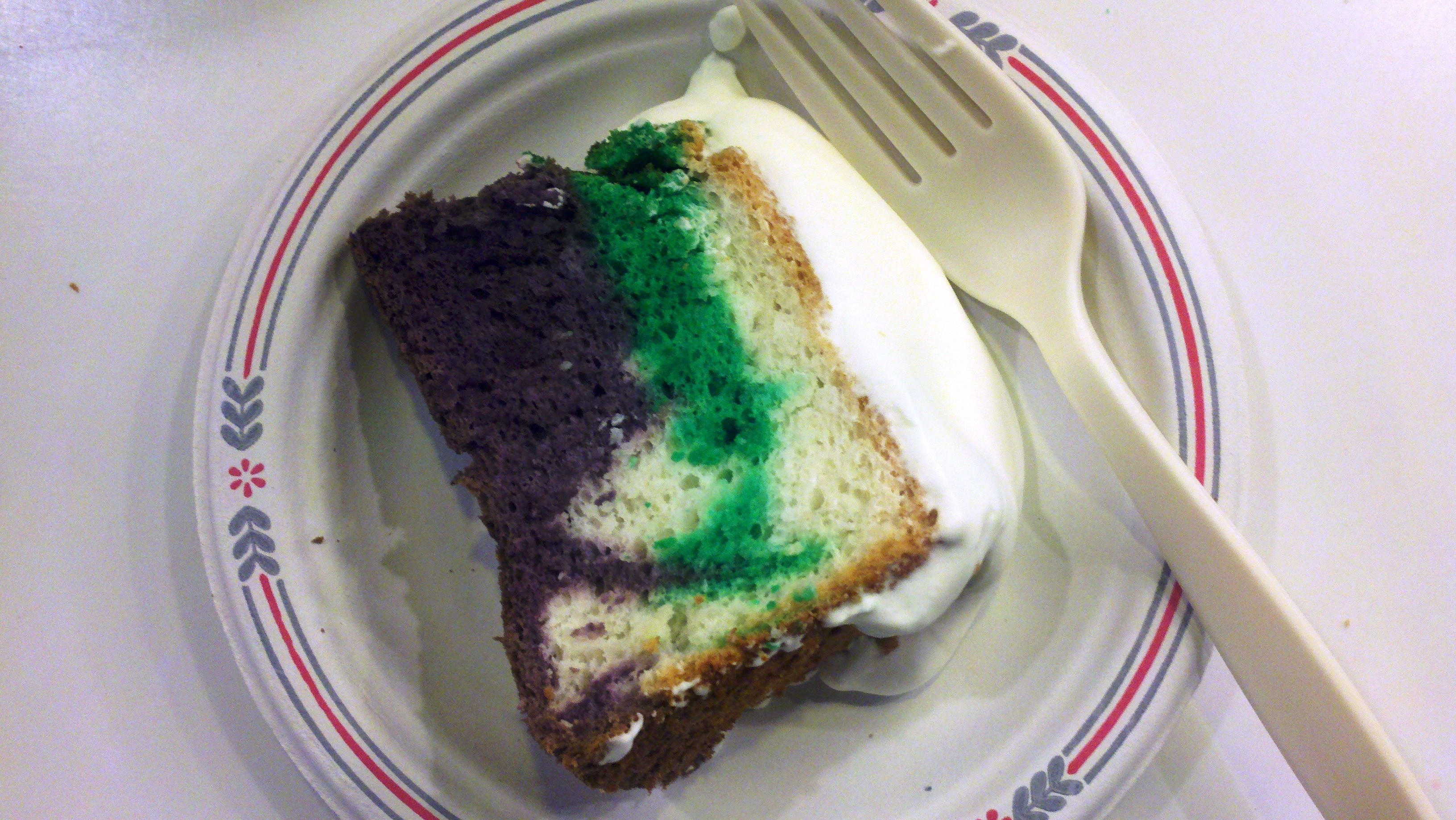 The raison d’être for yesterday’s purple and green cake was a Mardi Gras-themed happy hour. I opted for angel food cake (with a little food coloring folded in for fun), topped with fresh whipped cream. People loved it, and I received more than one request for a pink variation on Valentine’s Day.