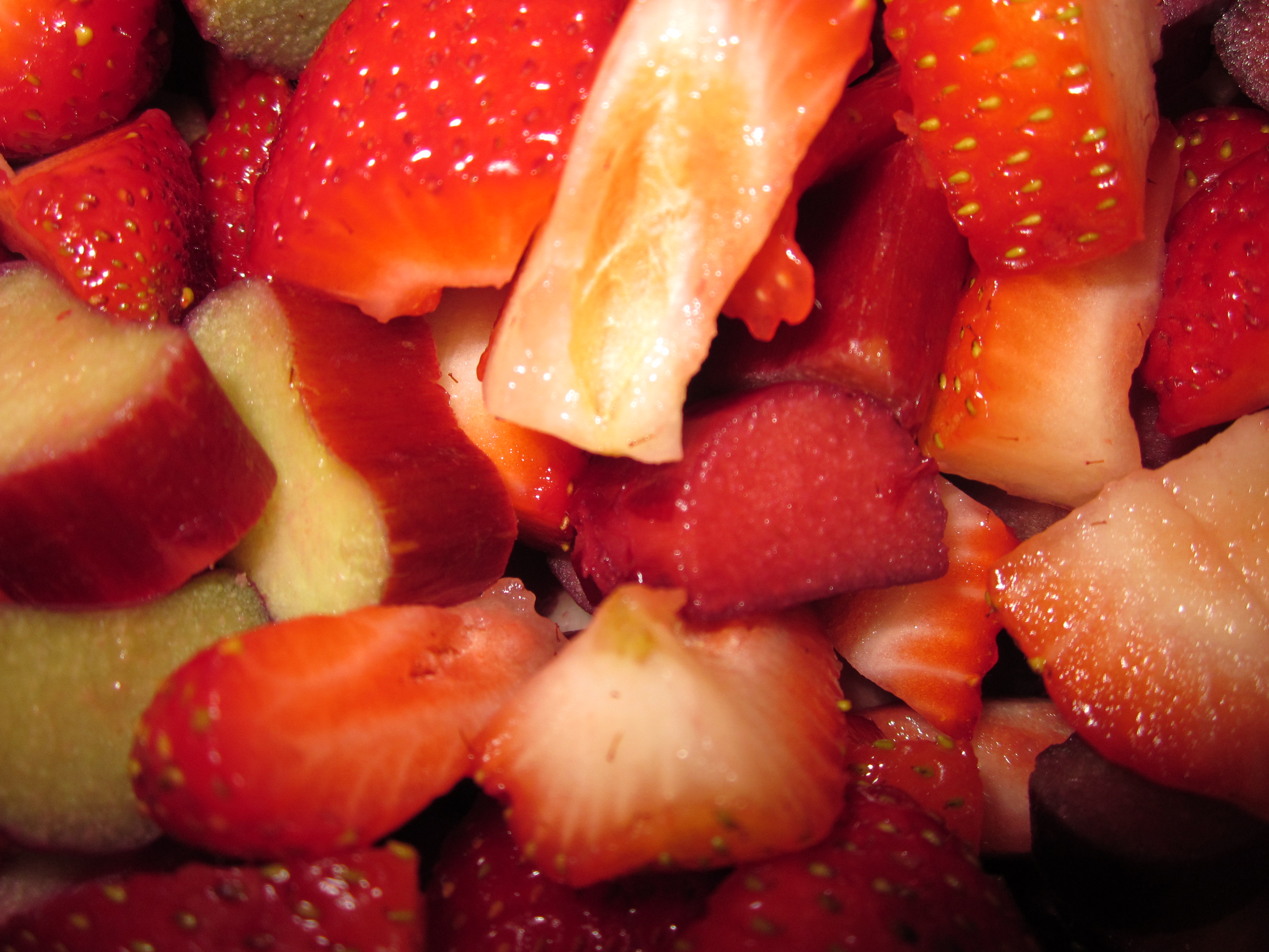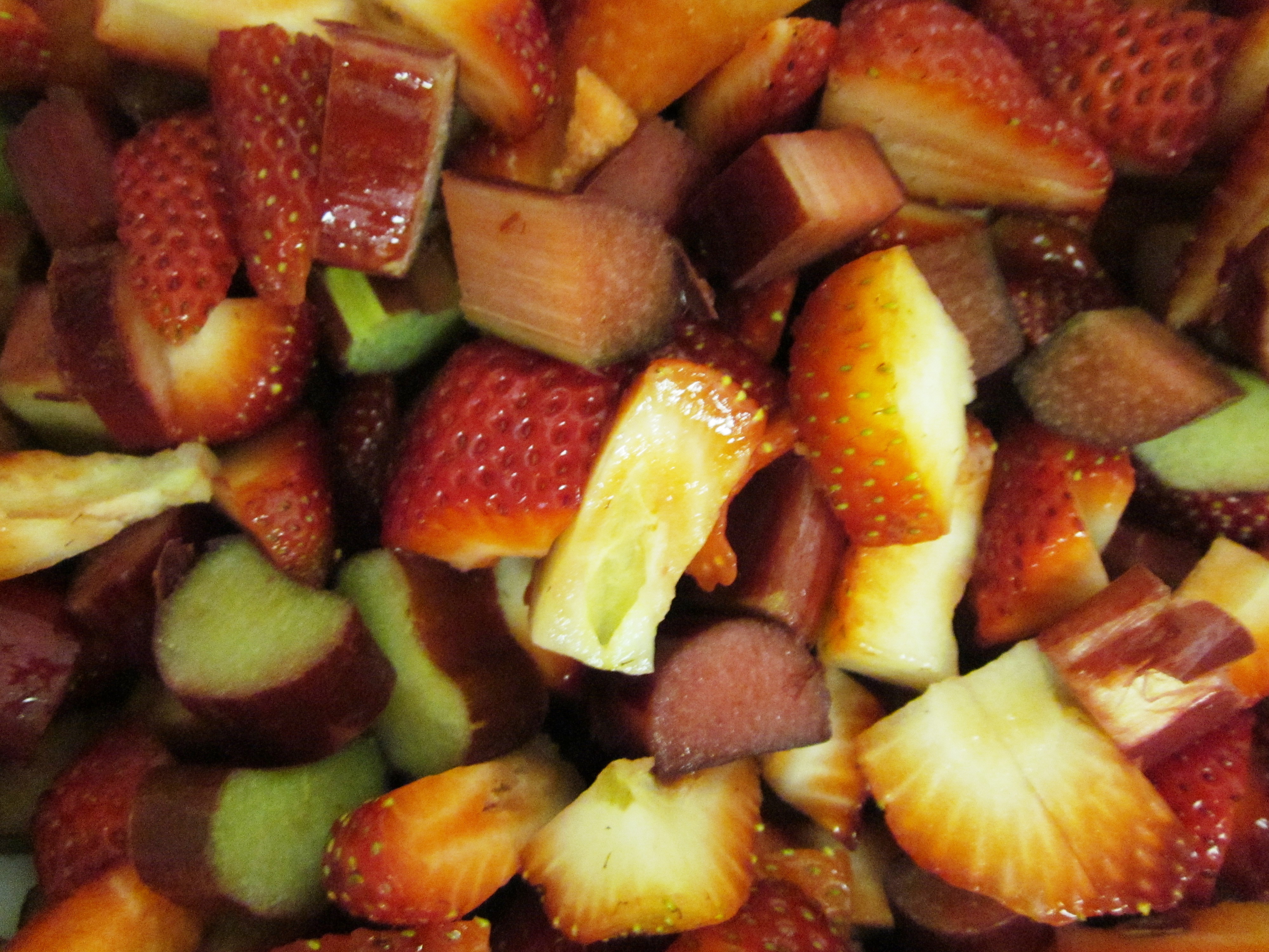 In large bowl, combine rhubarb, strawberries, and 1/2 c. sugar. Toss to combine well and set into colander over sink or bowl and let drain for 1 hour.