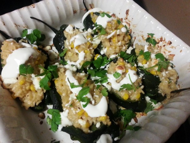 Enter stuffed poblano peppers. Amidst a couple hundred pages of gorgeous pictures, these appetizers jumped out to me. I served them with make-your-own nachos for an Easter egg decorating party.
