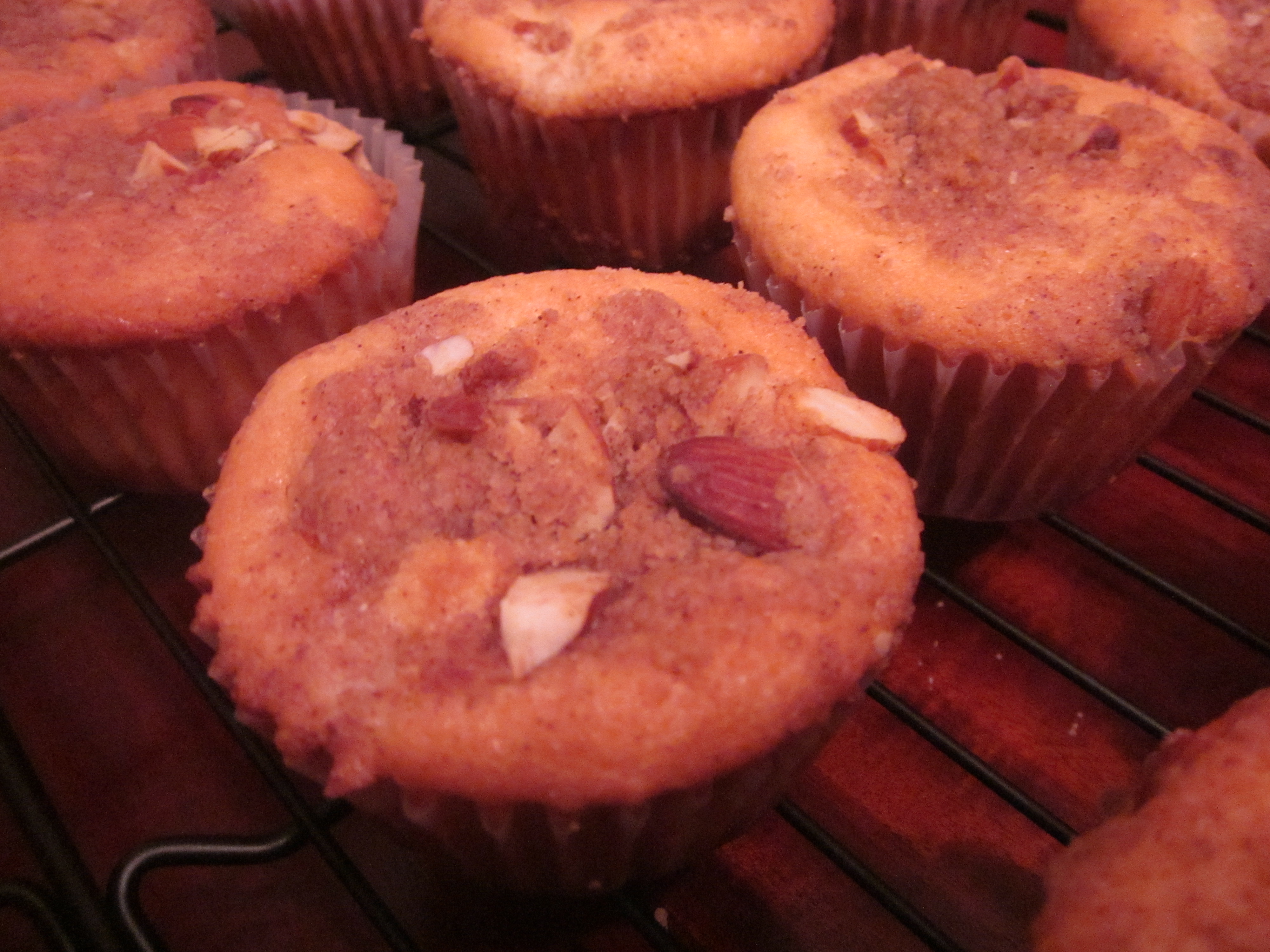 For streusel: Combine 2 tablespoons flour, brown sugar, and ground cinnamon in a small bowl. Cut in 2 tablespoons butter with a pastry blender or 2 knives until mixture resembles coarse meal; stir in almonds. Sprinkle streusel evenly over cupcakes. Bake at 350° for 27 minutes or until a wooden pick inserted in center comes out clean. Cool in pan for 15 minutes on a wire rack, and remove the cupcakes from pan.