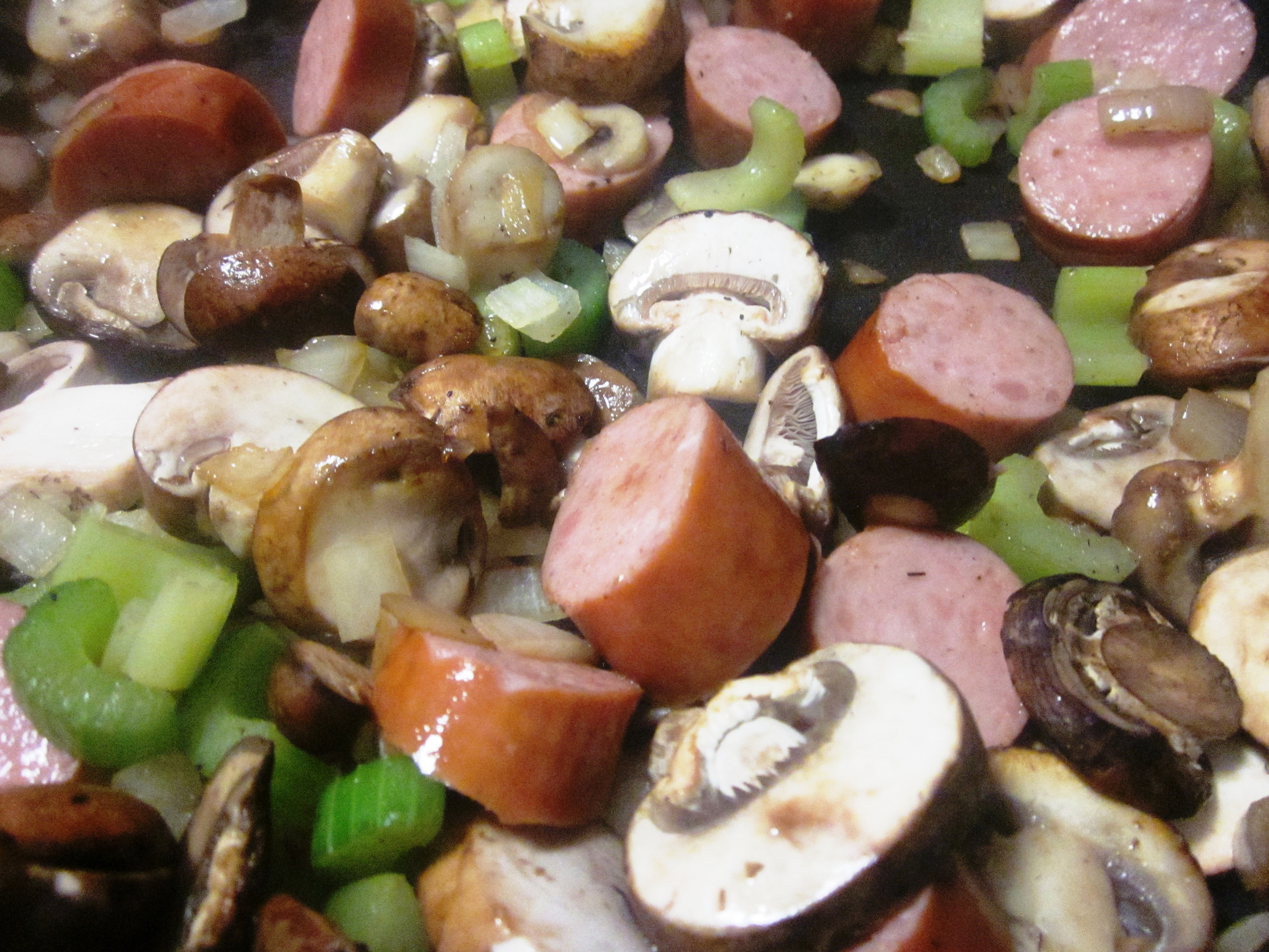 Meanwhile, heat oil in a large Dutch oven. Add onion and celery and cook 2-3 minutes. Add sausage and mushrooms. Cooking, stirring occasionally, until sausage is browned and vegetables are semi-tender. Add rice and its broth to the sausage and vegetables. Simmer, uncovered, until rice has “bloomed.”