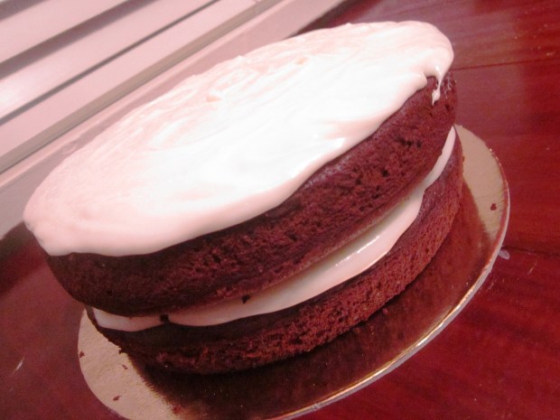 Two final tips. One, don’t let the look or texture of the batter pre-flour/cocoa freak you out. It’s not appetizing, but trust me: it will work itself out. Second, don’t drink the rest of the wine in the bottle until you’re sure you have enough powdered sugar to make the frosting, or you’ll find yourself on the couch waiting to sober up so you can drive to the store.