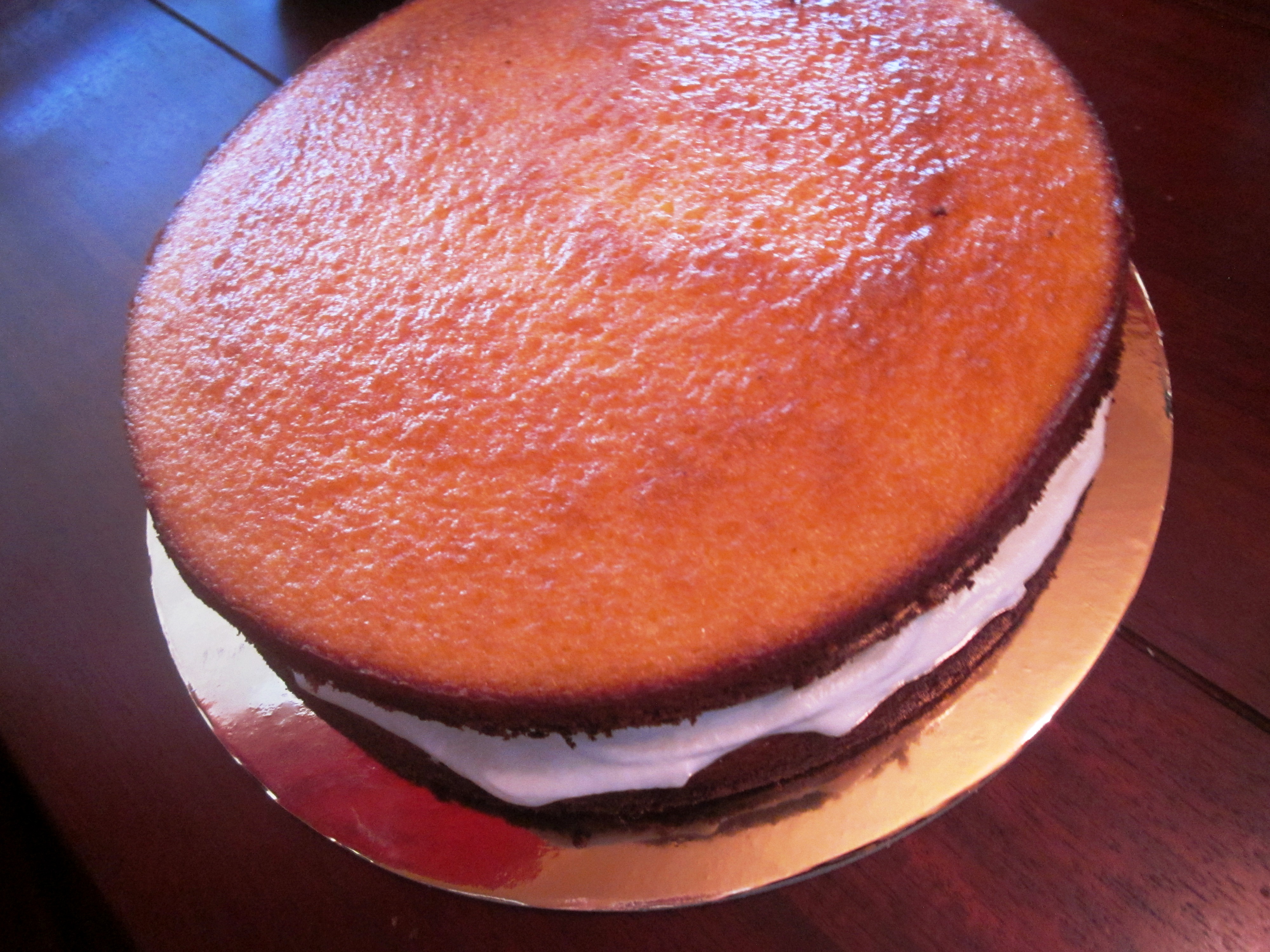 Arrange one cake layer on a serving platter or cake stand. If desired, use a long serrated knife to level the top of the cake; discard scraps. Spread chocolate thickly over bottom layer, then top with second cake layer. Level the top of the cake if desired.